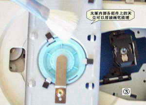 ③用毛刷擦掉光驱内部各个组件上的灰尘,随后用干软布轻轻擦掉各个齿轮及滑杆上的灰尘。