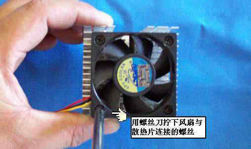 ②用螺丝刀拧下风扇上的螺丝,将风扇从散热片上卸下。