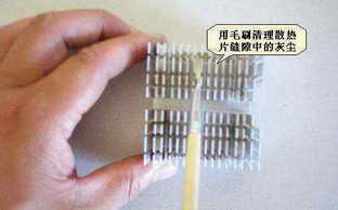 ④清洁散热片时,我们应用小号油画笔对散热片的每个缝隙进行清扫。