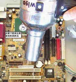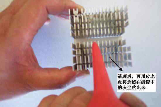 ⑤随后再用皮老虎将散热片里面的灰尘吹出。吹风时要远离其他组件,防止其他组件沾染灰尘。
