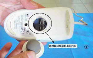 ①首先将鼠标底部的滚球挡板拧下,卸下滚球,用纸巾擦除传动轴上的污垢。
