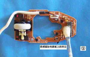 ②拧下鼠标背面的螺丝,拿下鼠标盖,用毛刷清扫鼠标电路板上的灰尘。
