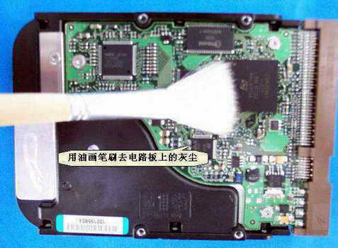 清扫硬盘时,首先用干软布将硬盘金属外壳上的灰尘擦拭干净,随后用毛刷清扫硬盘背面的电路板上的灰尘。