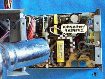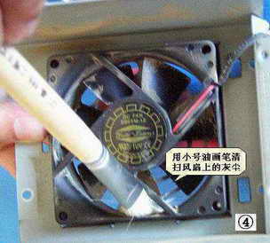 ④用油画笔清扫电源风扇上的灰尘,如果扇叶上的灰尘沉积过厚,可以用湿软布擦拭(要控制好湿度)。