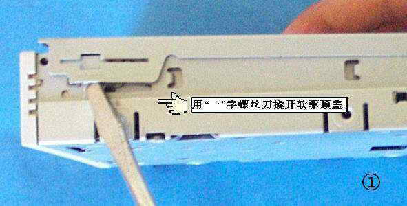 ①拆卸软驱时,用“一”字螺丝刀撬开软驱顶盖。
