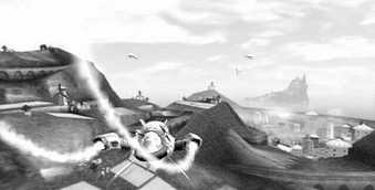 敌人的飞船被击落后仍然不放手,这时放下气垫船进入飞船去关掉开关,才能挣脱激光光束的束缚。正想将飞船停在中央的停机坪上却遭到大量敌机的攻击。