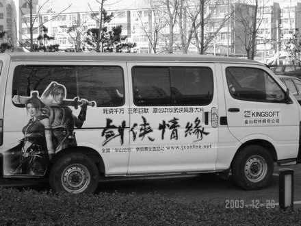 话说阿当随着新浪游戏频道的记者去他们的办公地点参观(搂搂兔:快把你A来的东西分我一半,不然我就揭露你此行的真正目的。阿当:晕!你都说出来了,我才不干呢!),结果得知金山软件公司和新浪游戏频道同在一栋大厦里。不过由于时间是周末,听新浪游戏频道的记者介绍,金山软件公司除了值班人员以外应该没有阿当认识的人在。本来阿当离开的时候还很遗憾,不过却在停车场里发现了金山软件公司的一辆面包车(见图1)。阿当不由得感叹金山软件公司的广告意识还真是好啊!虽然这辆车不可能对《剑侠情缘网络版》的推广起到太大的作用,但是如果能够将这些细小的环节都利用起来,那样的宣传效果就超乎想像了。相比现在网络游戏推广活动中不时出现的抄袭现象,金山软件公司的做法倒是值得大家借鉴。
