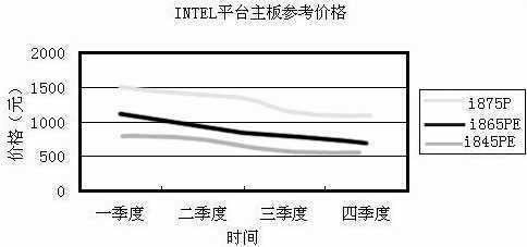 年初,Intel的主力产品是845D/845E/845PE/845G/845GE/845GL/845GV系列,其中i845D/845GL为低端,i845E/845G为中端,i845PE/845GE为高端。4月,随着800MHz FSB的新P4 CPU的发布,Intel也相应发布了新的芯片组。到今年12月为止,Intel芯片组的高端已经是875系列,价格大部分在1100~1200元,部分品牌(如EPoX)的i875P主板甚至降到了7XX元;中端为i865PE/865G/848P,主体价格在600~900元,这也是市场出货量最大的产品。而i845系列已经属于低端,售价多在400至500元之间。