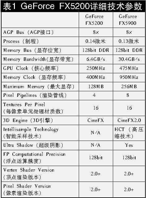 从这张表可以看到,GeForce FX5200相对GeForce FX5900主要有几个方面的简化。首先是制程,FX5200采用的是0.14微米技术,因此在核心工作频率方面会大大低于FX5900,但是制造的成本会低一些;其次是渲染管线,FX5200只有4条,是FX5900的一半,因此像素填充率相对FX5900大打折扣;再次就是Intellisample技术,由于缺少对该项技术的支持,GeForce FX5200即便和同频率的FX5600XT相比,在DirectX9环境下或者是开启全屏抗锯齿后的性能也要差一些。另外,FX5200也不支持Ultra Shadow技术,在某些使用了该技术的游戏中,只能采用软件模拟的方式运行,速度会受到影响。