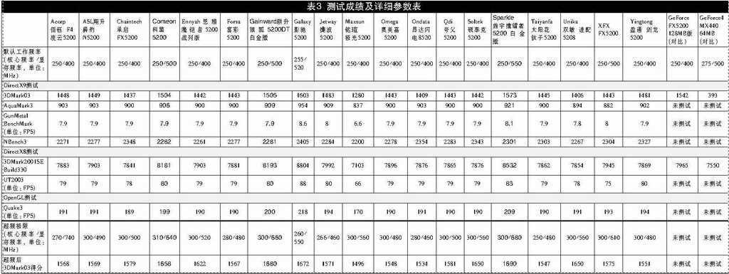 除了基本性能测试外,我们还进行了超频性能测试,超频测试得到的每款显卡的频率极限以及在超频极限下的3DMark03测试成绩将是考核的重点之一,另外,所有测试均在1024×768@32bit环境下完成。测试平台见表2。测试成绩见表3。