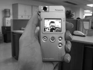 超轻薄的感觉肯定是有了,开机的速度也很快。镜头可以旋转180度,不过闪光灯设定在机身正面,所以如果把摄像头转到LCD一面(背面),拍摄的时候闪光灯就不起作用了。由于属于便携式机型,为了拍摄顺手,机器在背面和侧面各设有快门按键(图2)。机器的操作键很简单,除了菜单键(MENU)、快门和REV键,就是一个橘黄色的方向键了,其作用就像IBM笔记本电脑上的触摸杆,在菜单中调节设置一键搞定,不过灵敏度太高了,用户使用的时候可能需要适应一下。机器侧面还设有麦克风接口,做MP3使用的时候,使用附带的松下专用的耳机(接口比普通的3.5mm的耳机接口要细)即可使用了。