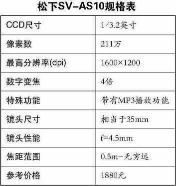 松下SV-AS10的体积轻薄,仅有57克重,拿在手上就像是拿着狭长的女式化妆镜(图1)。镜头可以做180度旋转。从厂商提供的资料来看,共有7种颜色选择,我们看到的这款为淡蓝色。凡花哨的机型,多定位为时尚普及型,面向年轻一族,由此也可看出厂商定位。该机使用SD卡存储,随机附带8MB存储卡。使用1/3.2英寸200万像素1/3.2英寸CCD,不具备变焦功能,光圈为F4,带闪光灯。1.5英寸LCD。最高分辨率可拍摄704×480、30帧/秒的短片。MP3播放支持wma、mp3、AAC格式,满电状态下可连续播放约10小时。