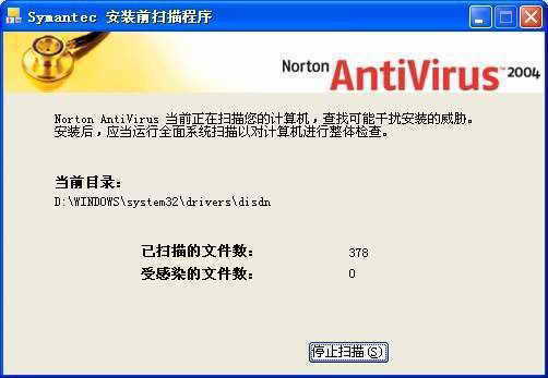 如果在染毒环境中安装杀毒软件,就可能导致杀毒软件本身也被感染,造成的后果可想而知。《诺顿网络安全特警2004》安装程序考虑到了这一点,它把安装前预扫描功能做到了安装程序中,安装前能预扫描整个系统分区,在确定没有感染病毒时才继续安装(图1)。