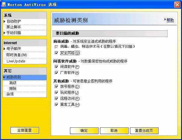 在Norton AntiVirus 2004里,一些以前不处理的程序,如对数据保密性构成威胁的程序(间谍软件,广告程序),一些可能被恶意利用的程序(如拨号程序、玩笑程序、远程访问程序等)也被列入了查杀范围(图2)。