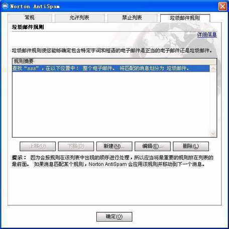 Norton AntiSpam的反垃圾邮件有三个级别可以设置(高,中,低),一般用户不用设置就能防止大部分的垃圾邮件,不过总有漏网之鱼,这时就可以自己创建邮件规则来过滤垃圾邮件(图3)。