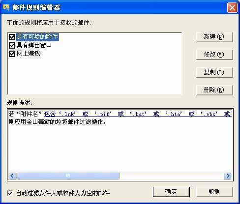 打开《金山毒霸6》邮件规则编辑器,我们可以看到程序已经默认设置了三个规则。这三个邮件规则的实用性都比较强。