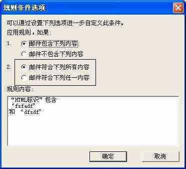 (2)规则条件选项中的某些设置没有体现出“易用性”原则。如果新建一条规则,然后在其中添加多项需过滤的内容,《金山毒霸6》针对该条规则的“规则选项”里默认的是“邮件符合下列所有内容”进行过滤,这样会产生只有当符合所有内容的邮件才会被认为是垃圾邮件。但事实上大部分时候垃圾邮件只要符合规则里的任一个内容就应该过滤。
