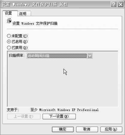 这条策略用来设置是否启用Windows文件保护。鼠标双击打开该策略,系统默认是没有启用文件保护功能(如图),点击“已启用”单选项,如果你想每次启动系统都进行扫描,在“扫描频率”下拉列表框中选择“启动期间扫描”,如果只想在安装文件时进行扫描,选择“启动期间不要扫描”选项。