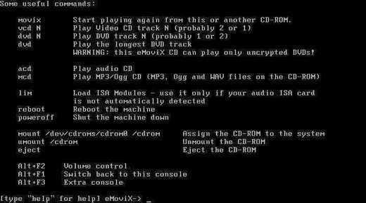 eMoviX(下载地址:http://heanet.dl.sourceforge.net/sourceforge/movix/eMovix-0.8.0_Setup.exe)仅支持CD和软驱启动,而且只能播放光盘中的音视频文件,仅支持用命令行方式进行操作,但它能在启动后自动按顺序播放光盘中的文件,不用人工干预;
