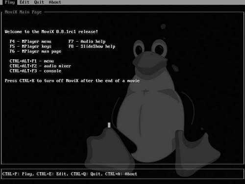 插入MoviX光盘进行启动,启动完成后会看到MoviX主菜单(图4),虽然能看到鼠标光标,但鼠标不能用,必须用键盘操作,不过不是命令行方式了。