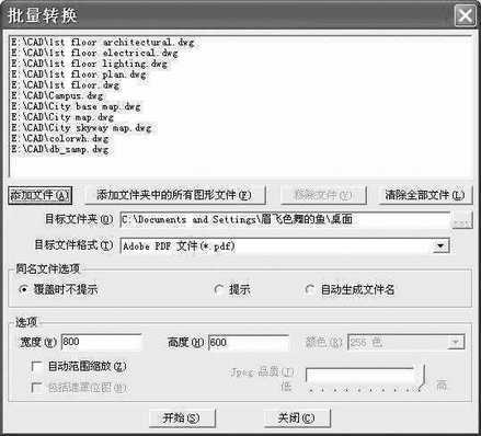 安装完成后,打开ACC,执行“文件→批量转换”,会弹出“批量转换”对话框,如图所示。单击“添加文件”或“添加文件夹中的所有图形文件”选择要转换的DWG文件,再单击“目标文件夹”中的“…”按钮,选择PDF文件的输出目录,然后在“目标文件格式”下拉列表中可选择“Adobe PDF文件(*.pdf)”。在下方的“选项”部分你还需要设置PDF文档的宽度和高度,这要由DWG图纸的大小来决定的。如果设置小了,图纸的多余部分会自动被截去,务必小心设置。最后单击“开始”即可开始转换。