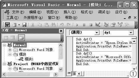执行“工具→宏→Visual Basic编辑器”命令,进入“Visual Basic编辑”窗口(图1),在左侧“工程资源管理器”窗口中,选中“Normal”选项或“Project”选项,执行“插入→模块”命令,插入一个模块(如“模块1”),双击“模块1”在窗口右边展开“模块1(代码)”编辑窗口(图1),按下述格式输入宏代码:
