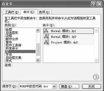 ②切换到“命令”标签下,在“类别”下面选中“宏”选项,然后将右边“命令”区中相应的宏拖到工具栏上。