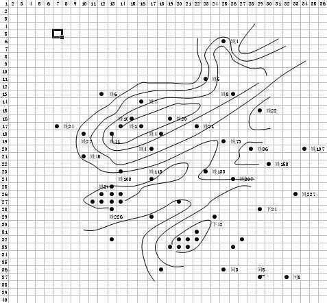 选择“浏览地图”工作表,全选工作表,设置行高为10.5,列宽为1.5,使该工作表成为标准坐标的栅格模板。然后按照井位部署图,使用“绘图”工具中的线条功能绘制地图示意图(图1),并在相应位置的单元格中填上“●”,作为油井的标志,该单元格位置的行数和列数的信息需要输入保存到“数据采集”工作表中的“井位”指标栏中,如井号为“姚4”的油井,其行、列号分别为6和25,则应在“数据采集”工作表中对应井号的“井位”指标栏中填入6和25。