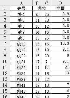 选择“数据采集”工作表,设置“井号”、“井位”、“产量”指标栏,“井号”中的数据是固定的,可根据实际情况一次录入;“井位”中的两项数据分别代表“浏览地图”工作表中标有“●”的单元格行、列的位置,只需要一次设置好,例如井号为“姚4”的油井(图2),它在“浏览地图”工作表中的单元格位置的行和列分别为6和25;“产量”中的数据根据油井实际生产情况的变化每日输入。如果某口油井当日停产,则产量为0。