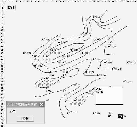 在“浏览地图”工作表添加一个命令按钮控件,该按钮与所编写的VBA程序链接(后文中详细介绍),如果要查询所有油井中产量在某个数值以上的油井,只要用鼠标点击按钮,就会弹出一个需要用户输入条件数值的文本框(图3)。在文本框中输入条件数值,则地图上所有大于这个数值的油井均显示为红色,否则显示为黑色(图4),并自动统计和显示符合条件数值的油井口数。当鼠标选中某一口油井时,自动显示该井产量(图5)。整体运行效果见图6。