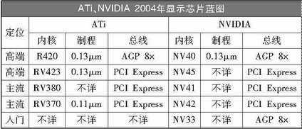 按照惯例,随后NVIDIA和ATi都会推出一系列的衍生产品。鉴于NVIDIA和ATi的图形芯片产品都呈现太多太杂且难于准确估计的局面,我们用一个表格来简要归类两家公司2004年的主要产品和定位。