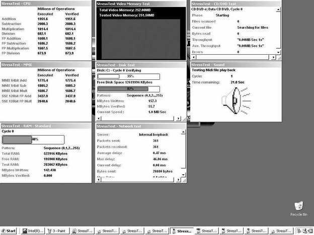 不过IDCC的监控信息倒是一目了然,系统信息、温度、风扇转速一应俱全。另外IDCC还提供了几个非常实用的测试工具。点击主界面左下方的“√”按钮,会运行一个名为Stress Test的软件,该软件通过让系统满负荷运行从而考验系统稳定性,是一个非常实用的工具。点击右下方的“√”按钮会运行Performance Index测试软件,通过对整体性能进行测试后获得一个系统总体得分,可以比较直观地衡量系统整体性能。(如图2为System Stress测试软件,图3为Performance Index界面。)