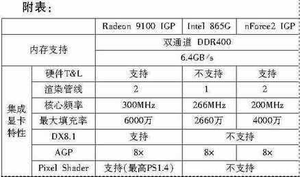 前文说过Radeon 9100 IGP内部整合的并不是R9200而是与它处于同一级别的显示内核,为什么这样说?R9200内部具有4条渲染管线而RS300中却被“节约”掉了一半,不过这样还是比Intel Extreme Graphics 2多1条,其核心工作频率为300MHz,这倒是比R9200高出50MHz。不过由于只是高出50MHz的工作频率,而渲染管线却少了2条,与R9200比性能还是会打折扣的。出于散热考虑,ATi将R9200中原先基于硬件的Transform和Lighting引擎抽离出来,使得系统以软件方式完成顶点处理,不过与其他整合显示芯片相比RS300还是提供了硬件T&L的支持。就硬件规格而言,Radeon 9100 IGP是现在P4整合芯片组中最高端的产品了。
