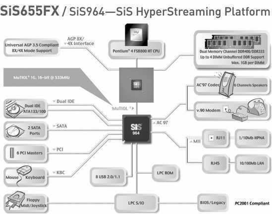 与SiS 648FX相比,SiS 655FX除了可支持800MHz前端总线、带Hyper-Threading超线程技术的Pentium 4处理器外,还增加了对双通道DDR400的支持。它同样采用了HyperStreaming架构和MuTIOL(妙渠)技术,并可提供最大容量达4GB的内存支持。