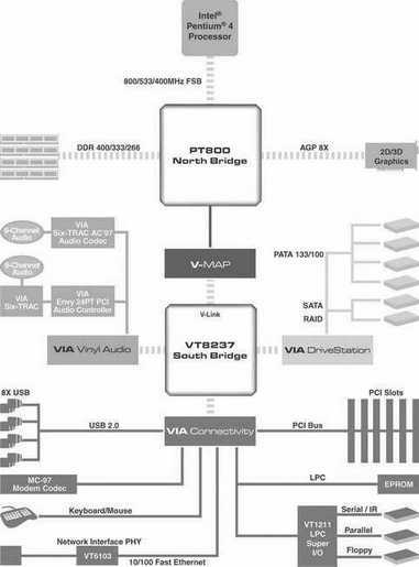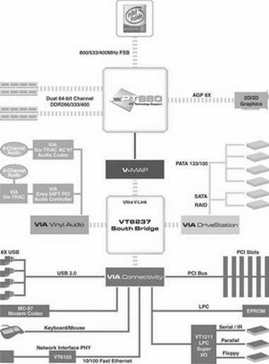PT800芯片组的基本规格和前面的SiS 648FX非常接近,同样是支持800MHz前端总线、Hyper-Threading超线程技术、单通道DDR400内存、AGP 8×显卡等。不过它可支持的最大内存容量达到了令人吃惊的8GB。该芯片组采用了VIA的FastStream 64技术,使用预取缓存的一个扩展阵列来降低内存控制器的延迟,从而可以获得一定的性能提升。