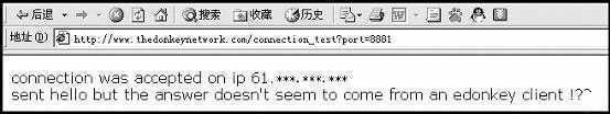BT默认使用的端口是6881,6882.....6889 的TCP连接 (每一个下载只使用一个端口,顺次分配)。我们可以上电驴的测试页面来测试一下端口,进入http://www.thedonkeynetwork.com/connection_test,输入6881,然后按下“test”,看一下BT下载端口的状态。
