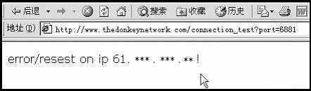 根据端口的状态,返回三种不同的结果。端口被封或者已开防火墙,如图1所示;端口开放,并且6881端口使用中(BT开着) ,如图2所示;端口开放,但6881端口未被使用(BT没开),如图3所示。BT使用的端口为6881~6889这几个,请一一测试端口。