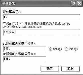 在该窗口中,“服务描述”一栏中可随便填一些就可以,“在您的网络上主持此服务的计算机的名称或IP地址”栏中填入你的机器的IP地址或机器名称便可(如我填的是本机名MYServer),“此服务器的外部端口号”中填写6881,“此服务器的外部端口号”中也填写6881,可别忘了选中TCP协议,然后按“确定”即可。