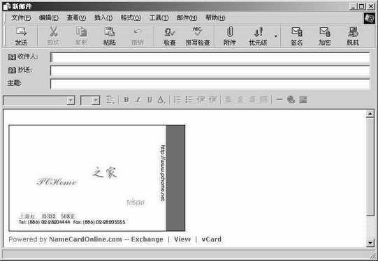 此时启动你使用的电子邮件软件(如OE)撰写一份新邮件试试,怎么样,是不是发现新邮件界面与以前有点不一样?邮件底部出现了你刚才制作的电子名片了(图2)。如果没有显示的话,那你就需要对邮件签名进行一番手动设置(此处以OE6.0为例):依次执行“工具→选项→签名”,在“签名”区域中你会发现有名为“Email Signature”的签名项目,选中该项,随后将它设为“默认值”即可。