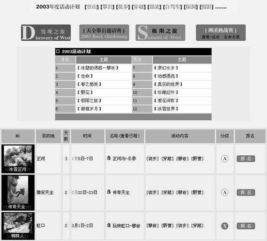 登录之后申请一个新用户,然后,在主页面上方的“终极旅程”中点击“最新计划”,在出现的页面中就可以看到由该网站制定的一年中所有月份的极限活动计划,包括目的地、天数、时间、名称、活动内容(比如徒步、穿越、登山、攀岩、野营等)、活动分级等(见图)。如果你是正式会员还可以参加相应的活动,点击相应活动中的“报名”按钮即可。