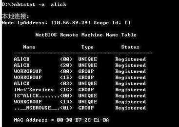 这样主浏览器的任务就会落到部分可信任的Win98系统机器上了。可以用nbtstat命令来查看计算机的情况,如nbtstat-a alick就是查看计算机alick的情况(图5),其中<00>代表客户机,<20>代表文件服务器服务,有“___MSBROWSE___”字样代表该计算机是主浏览器。