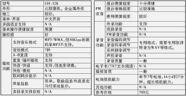 UH-128支持各种码率的WMA文件格式,但对低于96Kbps的低码率MP3不支持。采用中文菜单,提供了7种音效模式,支持快进/快退,但同UA-128相同,速度不佳。