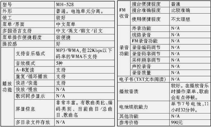 MH-528还具有FM收音功能。但在FM状态下,搜台却不太方便,而且不会自动消除无效的频道。