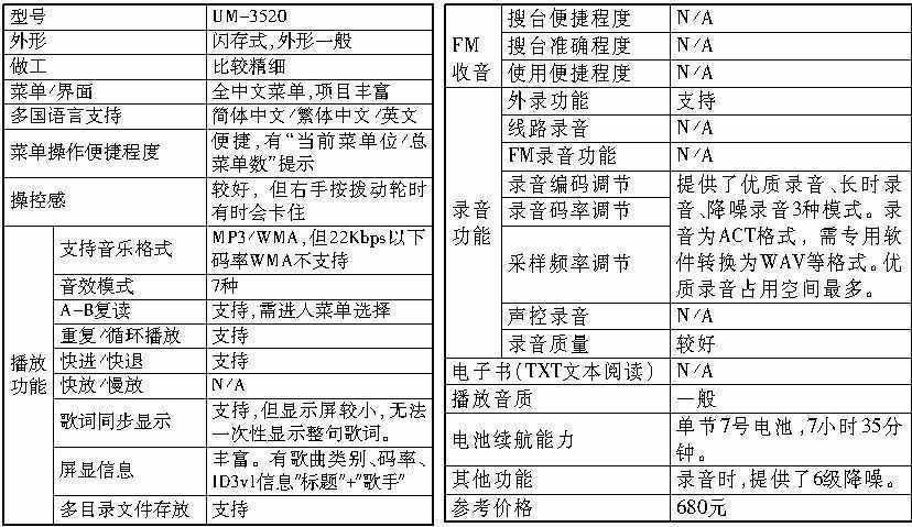 UM-3520的包装做得不好,内包装质量较差,大量的粉渣粘在机身上。但是,这款产品的功能倒是很强大。带有7种音效模式,支持lrc歌词同步显示,支持4种模式的录音,带有6级录音降噪,支持多目录歌曲存放,而且,整体操控感也比较好。