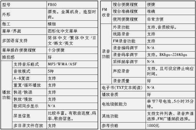 联想F860的价格为1000元,是我们参测产品价格的上限,但考虑到它丰富的功能,优秀的菜单设计,出色的音质表现,这1000元还是值得的。在此,我们授予它编辑推荐奖。