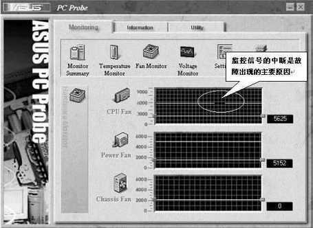 其间为了方便查看温度情况,我安装了一个主板监控软件──Asus Pc Probe,它可以监测主板和CPU的温度,以及CPU、电源、机箱风扇的转速和电压的工作情况,并能自动记录下来。正当笔者一时无从下手时,电脑再次发出了“嘀、嘀……”的报警声,这时Asus Pc Probe的程序窗口弹了出来,原来它也出现了报警,笔者正要仔细查看时,电脑突然间重启了。这时领导在一边说,该不会是这个监控软件的误报吧?笔者又仔细观察了一下电压监控项目,又有了新发现,在它报警的那一刻电压并没有出现太大的波动,但根据CPU风扇转速情况划出的连线中间却断了一块(如图),为什么会出现停顿呢?笔者观察风扇的转速,一直都十分均匀,没有停顿的现象,会不会是信号传输中断了呢?更换了风扇后,故障果然被排除了。