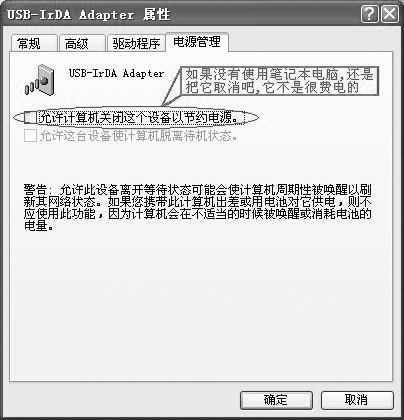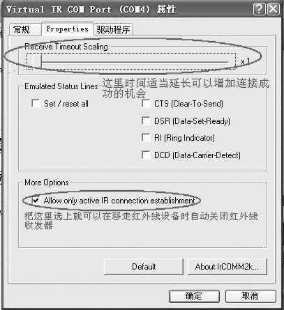 下一步便是要真正用好它的关键了:有的朋友说连接好后隔一段时间不用电脑就不能连接红外线设备了,这是因为Windows系统为了节约用电而自作聪明地关掉了你的红外线收发器,你只需要在红外线收发器的属性里面改一下就Ok了(图2)。最后还要在你刚才虚拟端口那里再修改一下,好让它变得更乖。在设备管理器里面打开端口中的“Vitrual IR COM PORT(COM4)”的属性,在Properties选项卡里将timeout值设置大一点(如果你需要常常移动你的设备),再把More Options打上钩,这样便不会发生当你移走数码设备时电脑还认为该设备正在与它连接从而造成下次连接该设备时系统报告占用端口的事情了(图3)。好了,现在你的数码设备已经可以乖乖听你使唤了,用上红外线来传输数据,真是无“线”自在呀,再也不用去摆弄那些线了。