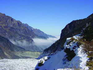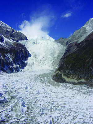 海螺沟景区位于6500多米高的落差形成的贡嘎山大峡谷之间。这里地形复杂,气候特殊。山顶终年积雪,年平均气温在-9℃左右。在半山腰的“二号营地”又有号称“康巴第一泉”的温泉,温泉水最高达90℃,人称“沸泉”(达到了该地海拔高度水的沸点,泉水可以沏茶或煮鸡蛋)。