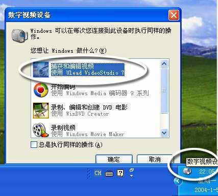 当DV和PC连接好之后,在任务栏的托盘区会弹出你的DV新硬件安装提示。接着会弹出数字视频设备选择窗口,如图2。这里我们选择《会声会影7.0》,然后点“确定”进入《会声会影》程序窗口。