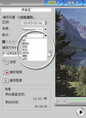 在“来源”选项显示捕获来源,一般默认是你连接的DV。接下来的“格式”可要好好设置了。在它的下拉菜单中除开DV外,提供了6种格式,对这几种都应有所了解(请参看几种常见视频格式的比较);在选择输出格式的时候,需要考虑几个因素。这包括期望的输出质量、目标回放设备和查看屏幕的大小等等。这里面的DVD和AVI格式的体积相当庞大,必须保留有足够的硬盘空间。一般我们选择VCD格式,体积小而且刻录方便。